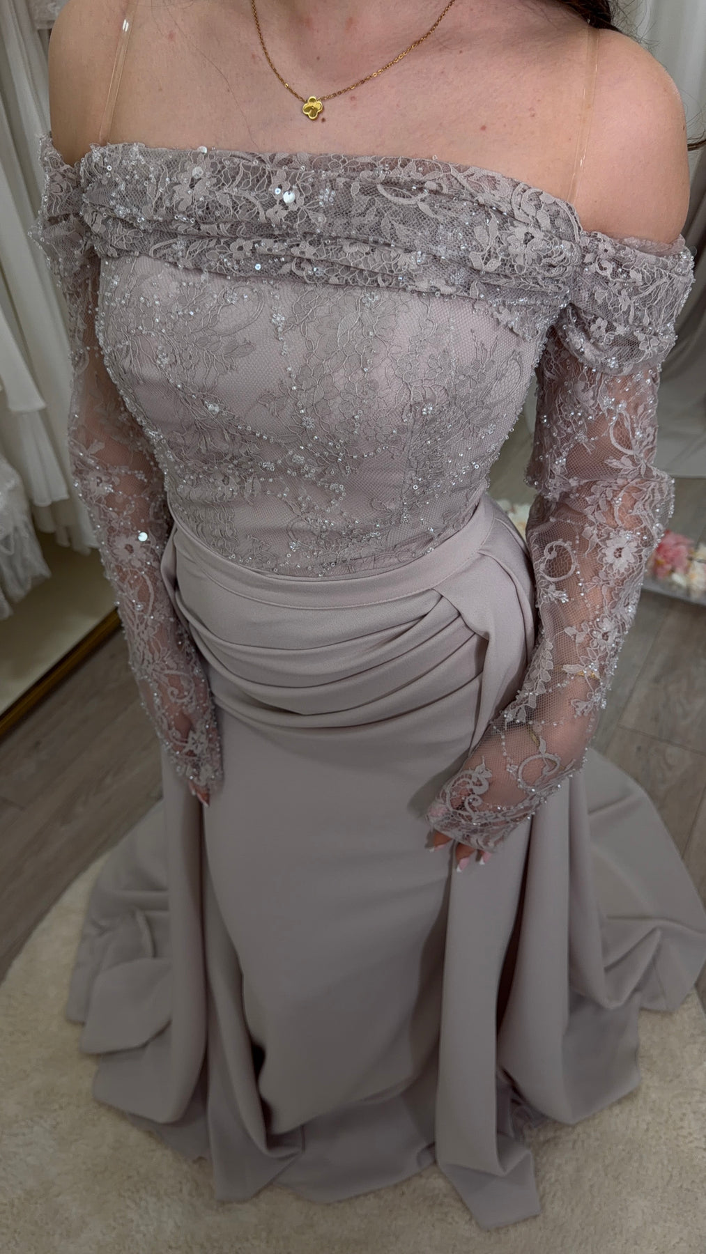 Das Off-Shoulder Design setzt die Schultern elegant in Szene, während das fein gearbeitete Spitzenoberteil dem Kleid eine romantische Note verleiht. Der fließende Überrock sorgt für eine luxuriöse Bewegung und unterstreicht die edle Silhouette.