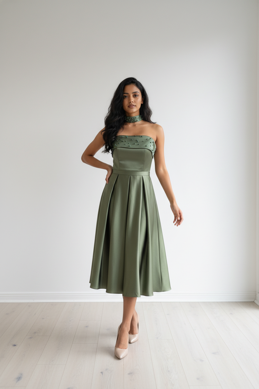 Dieses Silan Kleid ist ein elegantes midi Abendkleid, welches für jeden Anlass perfekt geeignet ist. Mit seinem zeitlosen Design und der hochwertigen Verarbeitung, verleiht es Ihnen einen stilvollen und edlen Look. Das Kleid ist bequem zu tragen und unterstreicht Ihre weiblichen Formen auf elegante Weise. Ein Must-Have für jede modische Frau.